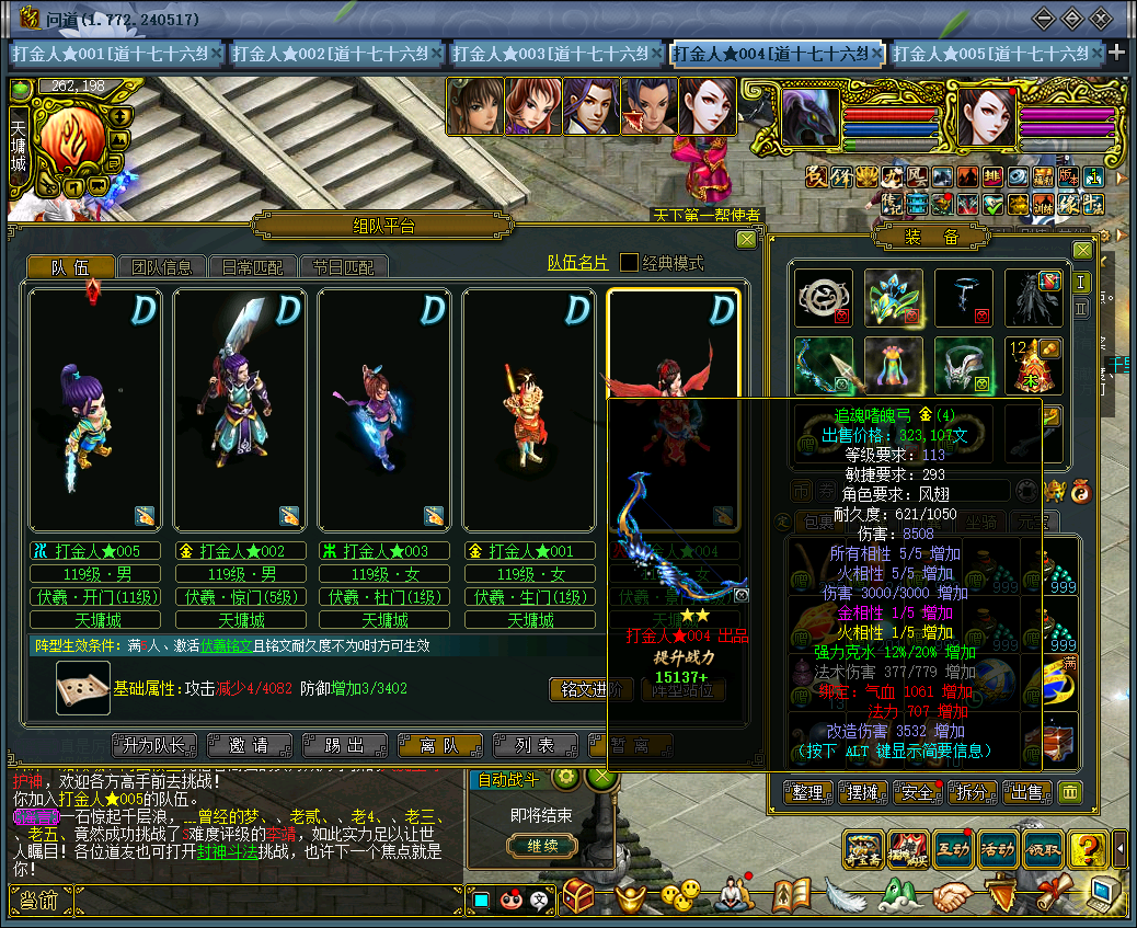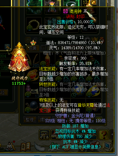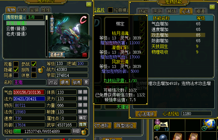主打就是一手白嫖,经过几次押镖和FB现在5养1弄了2件装备一个法宝,装备3500W一件,法宝12级**钟900W仙盟令全部换心法宝典给BB,争取不打妖石也是C,后续声望换归元争取白嫖Q3,这看到时候能不能争取做到10物伤吧.......