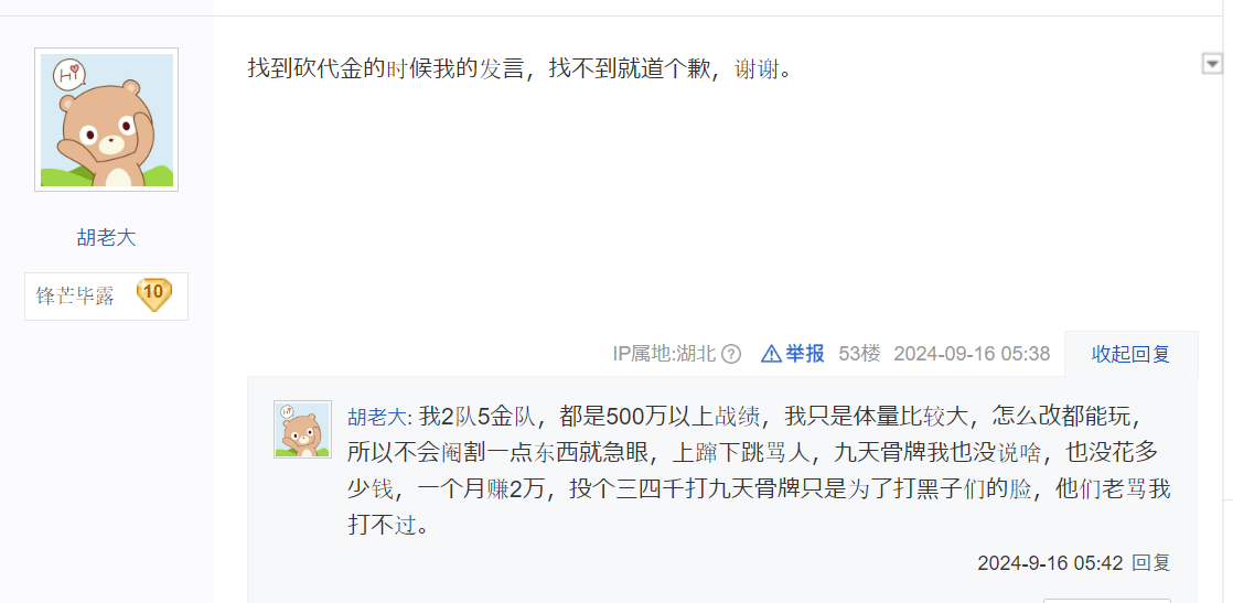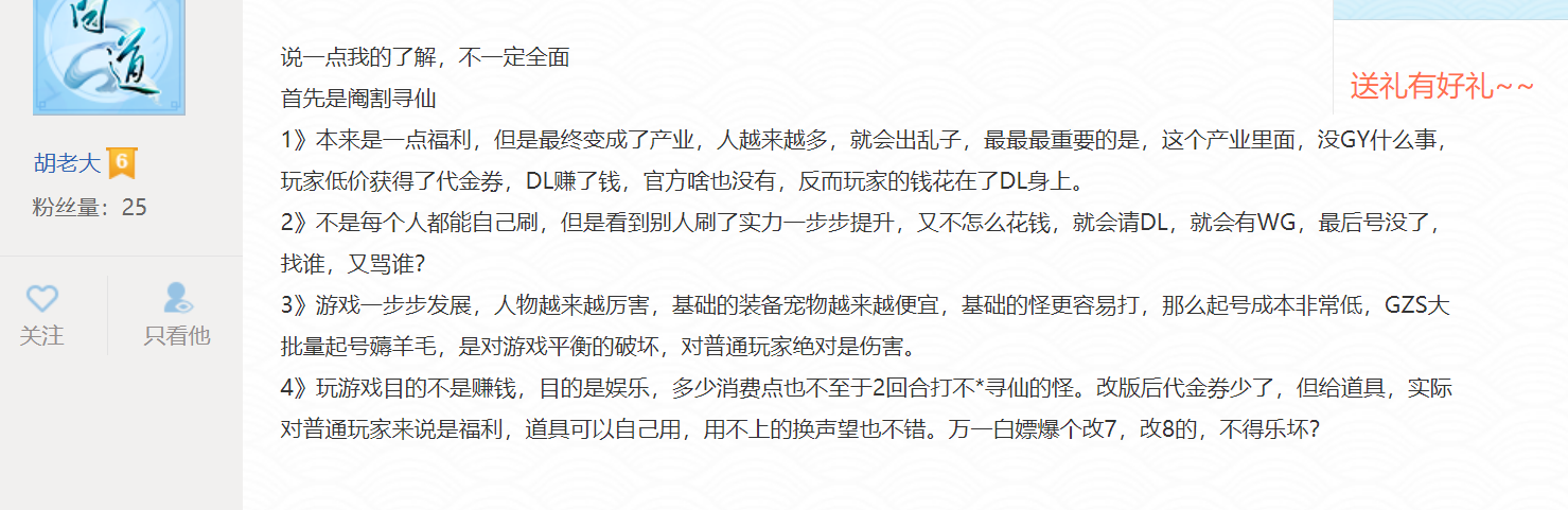 你真牛批!你是认为所有人起号都容易的很!你是所有的号都SSS+,你不花钱,你起一组号起来我看看!你站着说话不腰疼!我们纯娱乐玩家不比你们这群***玩家!我现在带的还是野外宝宝,变异都没!我就只是想有空玩玩,真是有钱人他就是把所有游戏改成点卡的人家还是玩!说是打击工作室!实则劝退白嫖玩家!别打着打击GZS的明目暗地里劝退白嫖玩家!官网直接出公告劝退一切平民玩家多好!