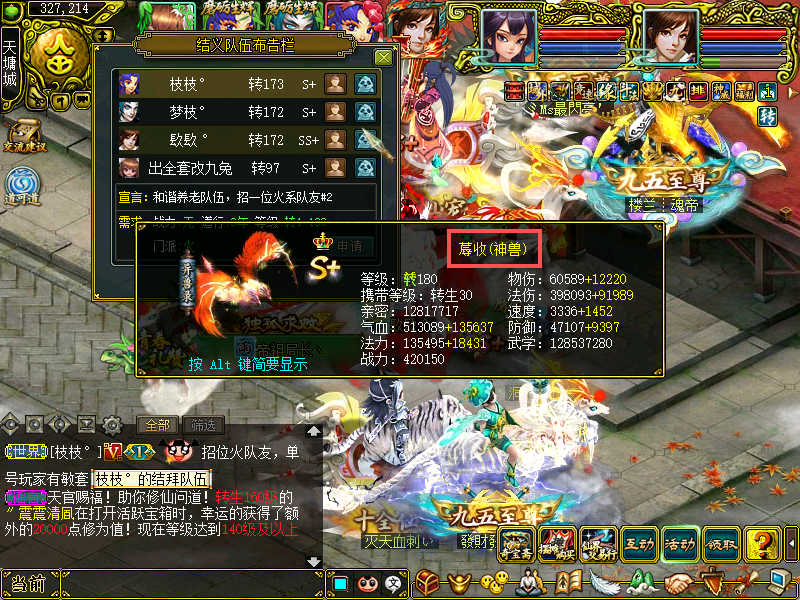 结义队伍布告栏宠物 假元灵显示为神兽。