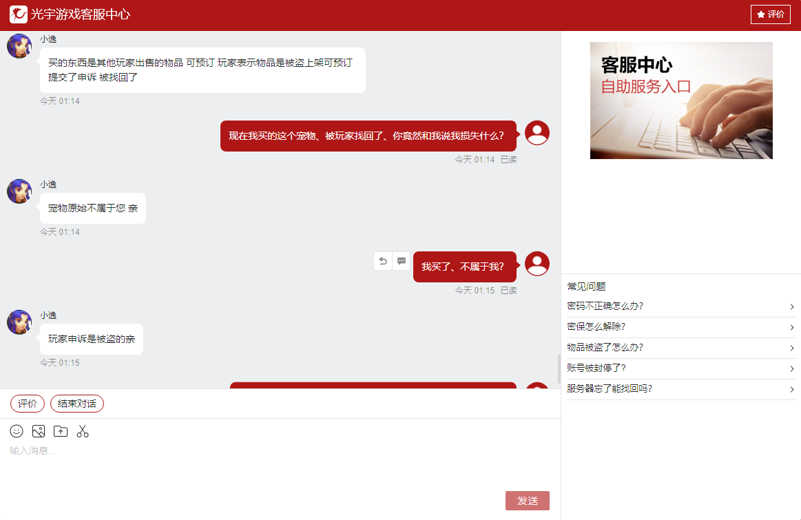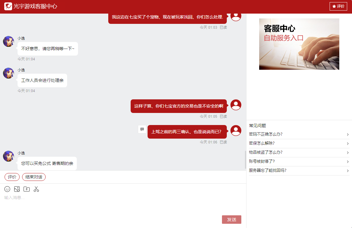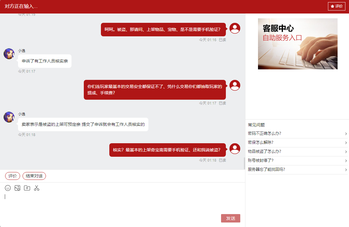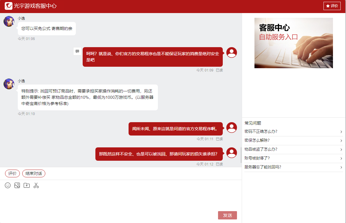 官方交易的程序都保证不了玩家的购买安全、请问这样的事情、我们该找谁处理?好像我们买家说什么都是没有用。话不多说、以下就是我和客服的聊天记录。