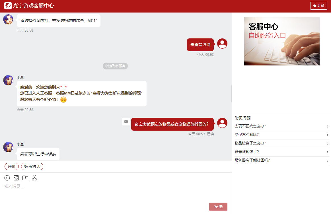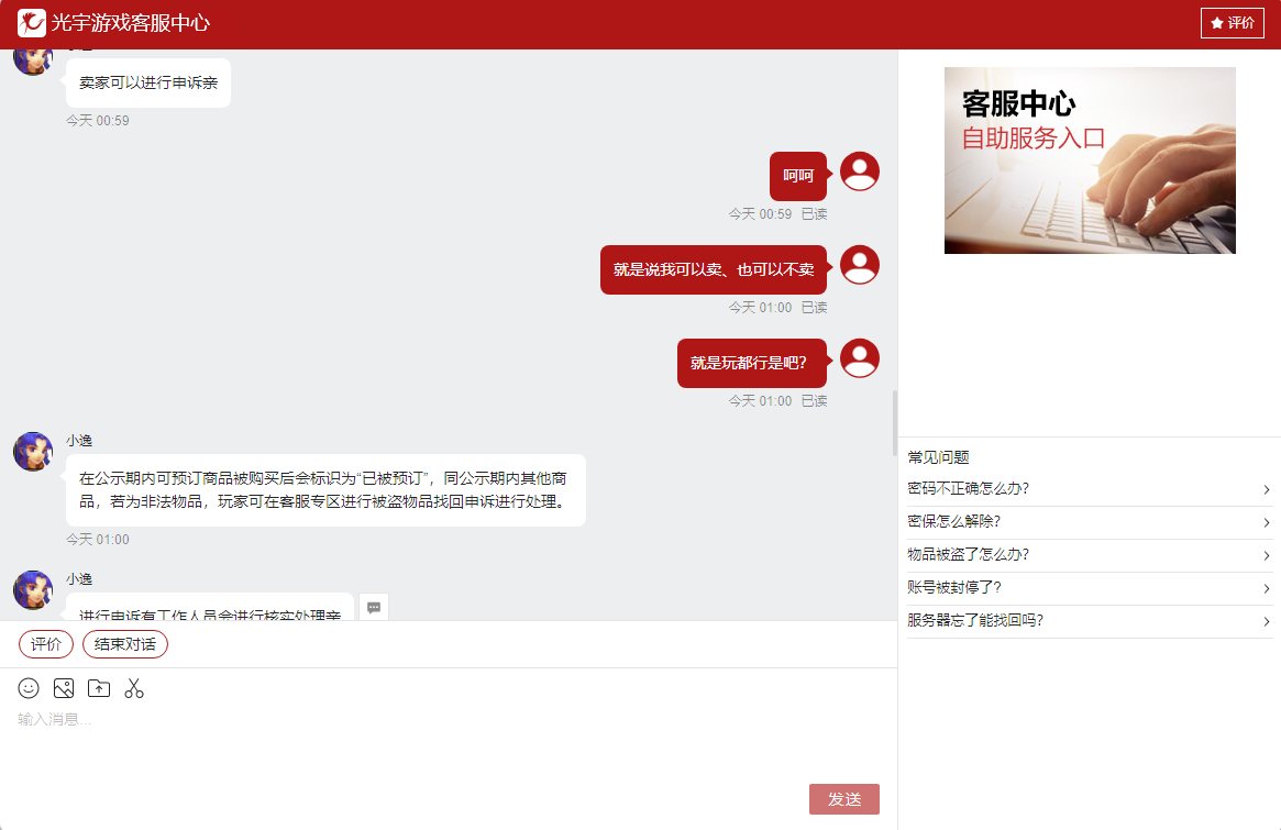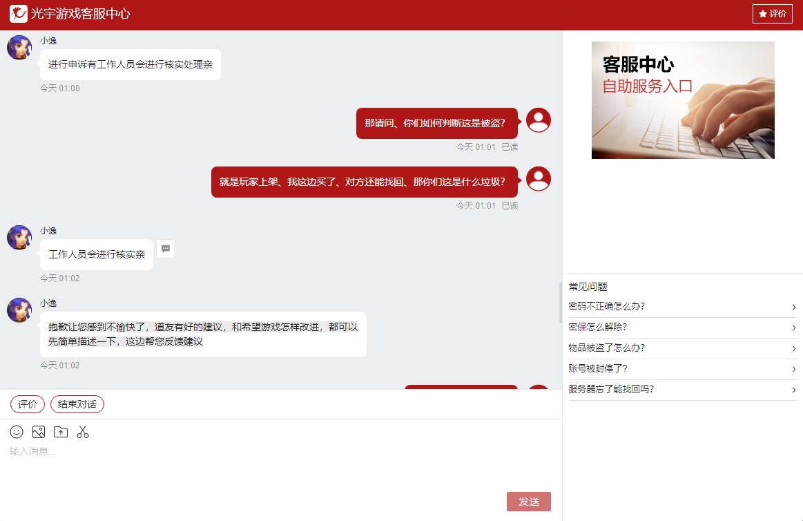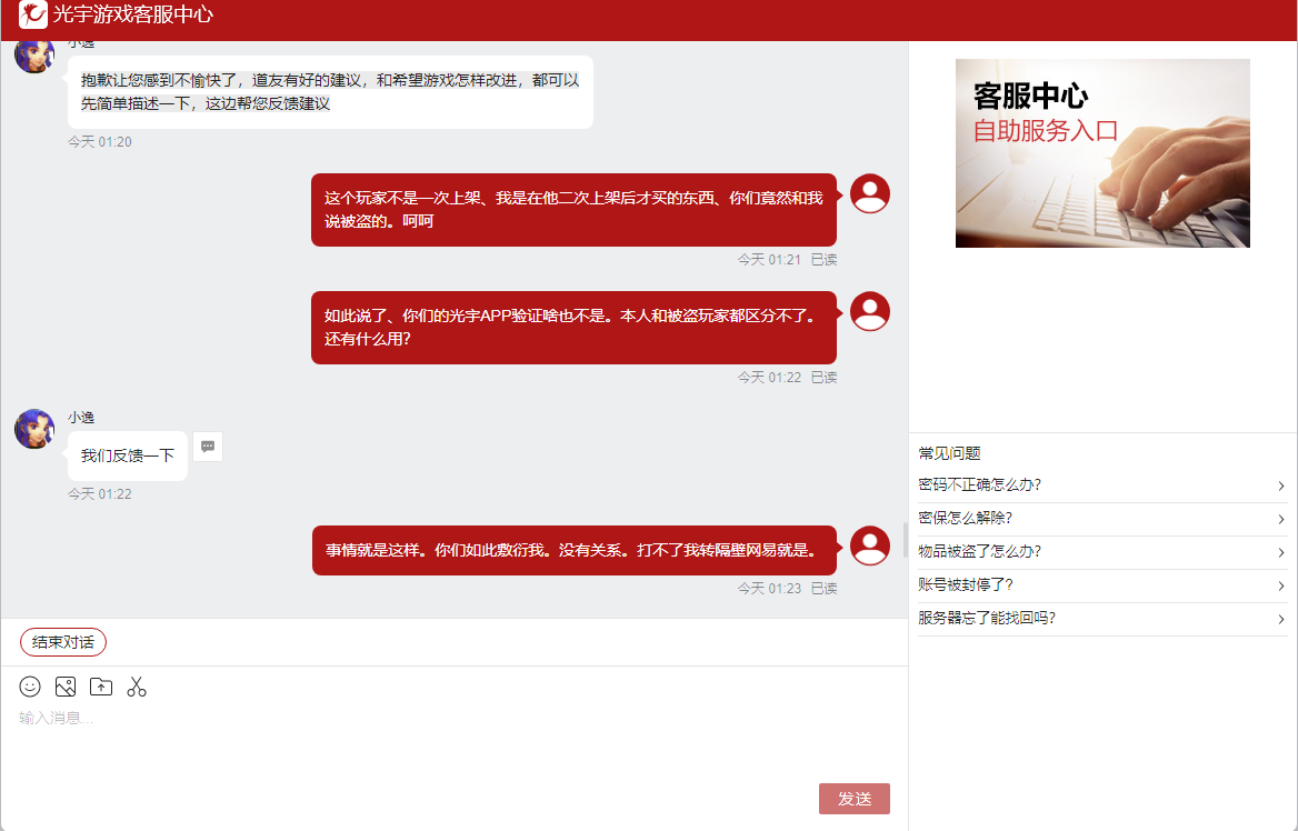 官方交易的程序都保证不了玩家的购买安全、请问这样的事情、我们该找谁处理?好像我们买家说什么都是没有用。话不多说、以下就是我和客服的聊天记录。