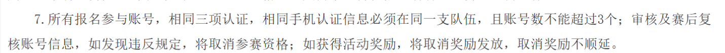 7.     所有报名参与账号,相同三项认证,相同手机认证信息必须在同一支队伍,且账号数不能超过3个;审核及赛后复核账号信息,如发现违反规定,将取消参赛资格;如获得活动奖励,将取消奖励发放,取消奖励不顺延。