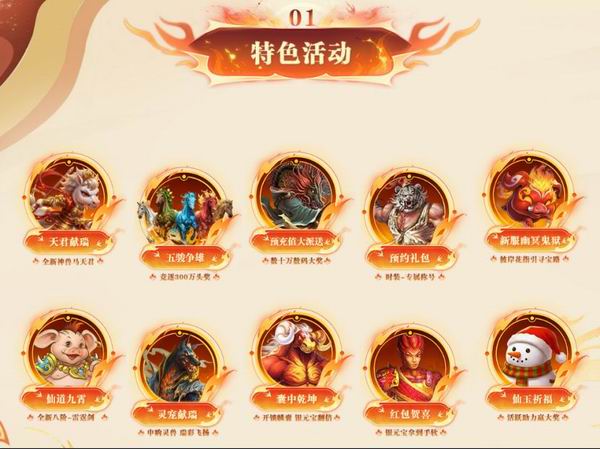 天君献瑞、五俊争雄、预充值大派送、预约礼包、仙道九霄、灵宠献瑞、囊中乾坤、新服幽冥鬼狱、仙玉祈福等多重特色活动火热开启,为大家送出笔记本电脑等数码豪华大奖,以及丰厚的商城道具、银元宝奖励。