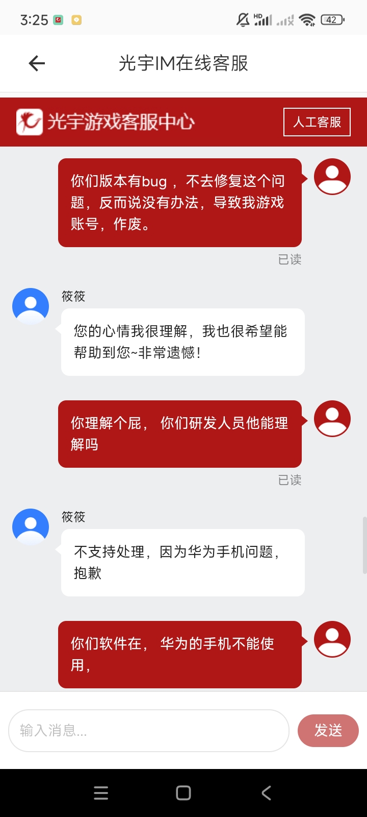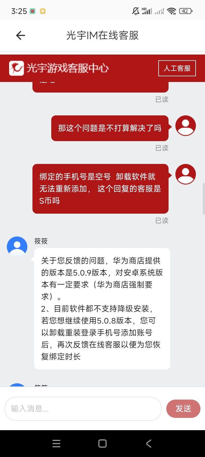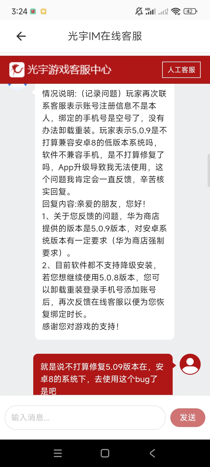 光宇app被强制升级5.09版本导致,无法使用,通过下载5.08版本无法,降级覆盖,由于手机系统版本是安卓8.0,光宇app5.09版本不兼容,目前客服就是无法给解决,注册手机已停机,注册信息非本人。
