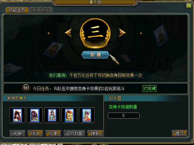 由于水号对应的变身卡比较少,经常需要这个切换功能,但是又不容易记住当天有没有切换过,有时候吃了**卡片,想要变的时候发现已经用过了,然后**卡片白吃了。能不能在使用过这个功能后,当天把这个按钮变灰,让人能一眼知道有没有变过