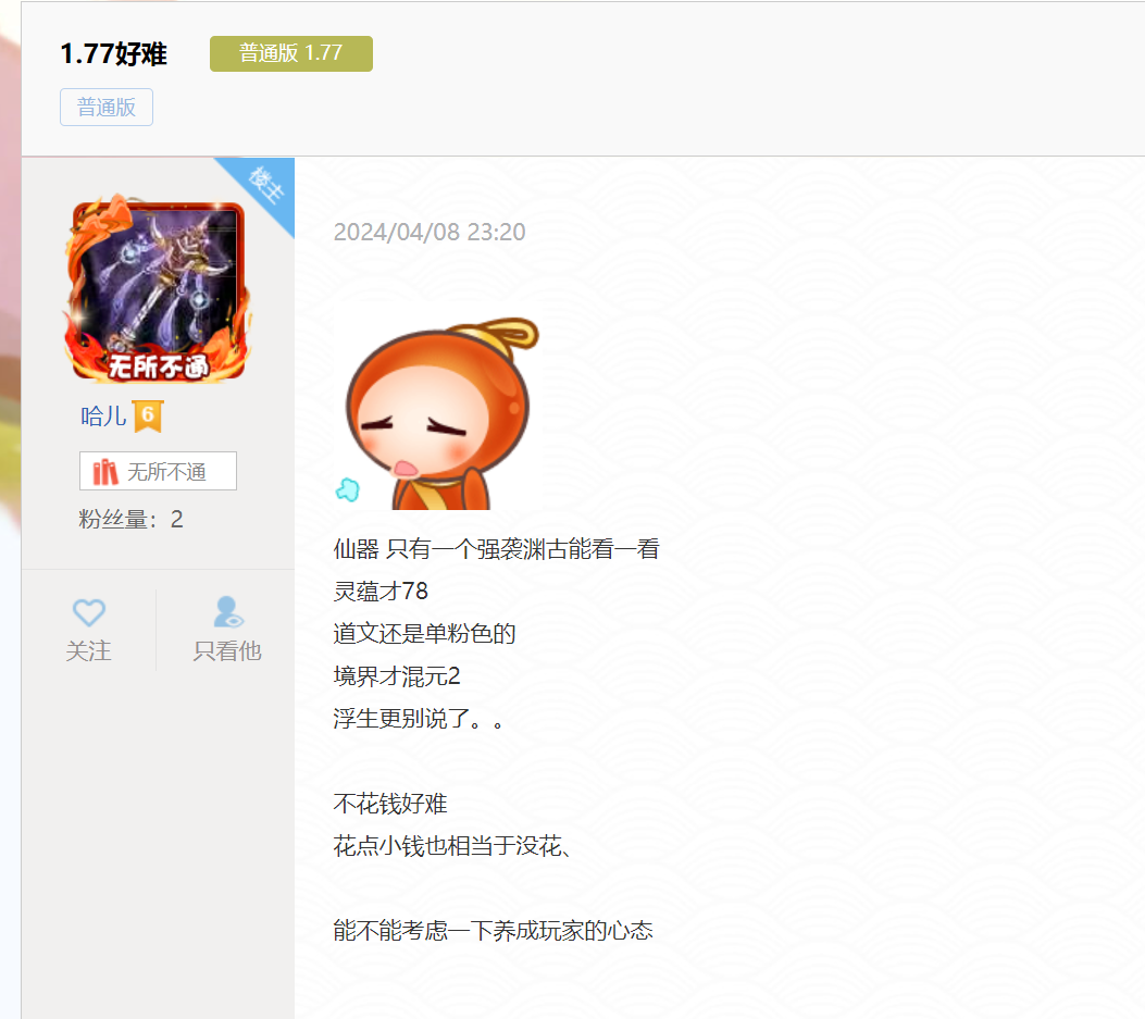 插播氪金难度 浮生-仙器/灵韵-道文 氪金度大家都应该有感觉 花1~2K像没花钱一样。