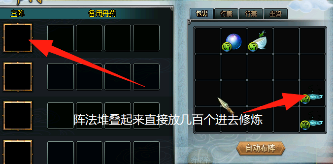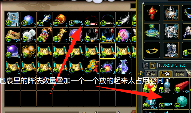 建议把放在包裹里的阵法改成数量堆叠。 一个一个放在包裹占用大部分空间拿出来还要清理一下。
