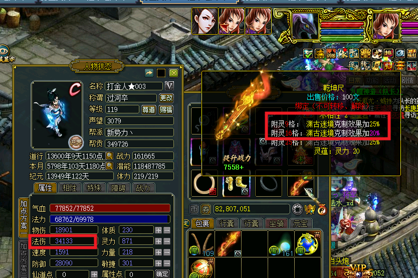 首先渊古克制数据如下,战斗前法伤34113,输出待测试,渊古克制45%(生效)
