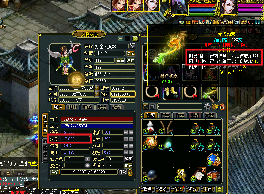 伤害数据如下:战斗前法伤29832,输出待测试,伤害471+943=1414(生效)