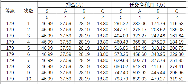 看表格,毁镖的成本太低了,按S镖计算,毁9次镖,再完成一次任务一个号才损失132万,能减少S镖产出游戏币4600万,能减少A镖产出游戏币3700万,能减少B镖产出游戏币2700万。按照2/3/5的权重分,平均减少3380万。这还是一个角色的。