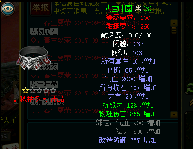 ◆。春生夏荣:我的装备比较**,一般的小BOSS还是可以应付的,平时就喜欢押镖,赚钱。然后在集市淘宝倒卖道具赚取差价,再就是在拍卖哪里捡漏。