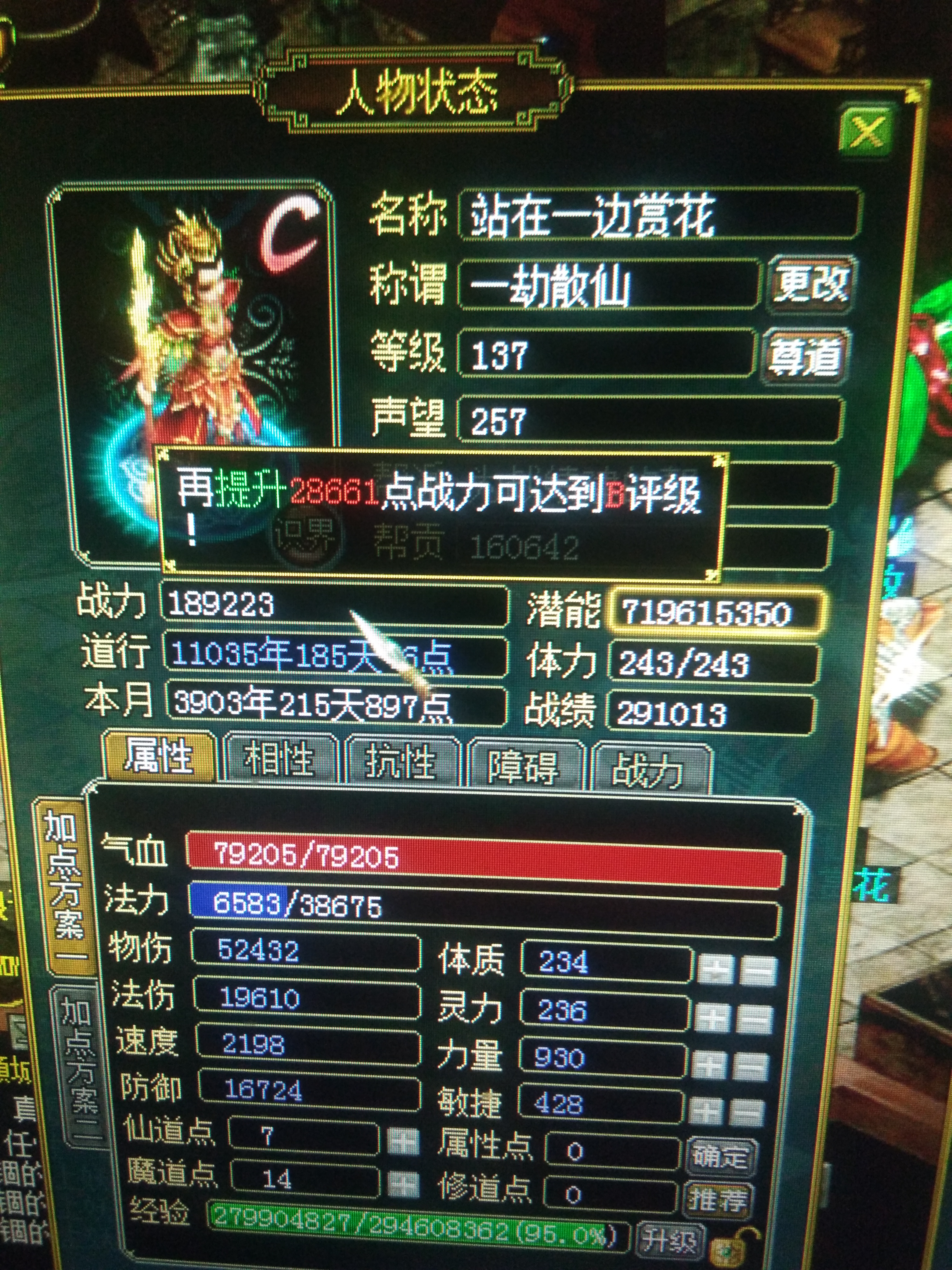 老铁们我说的是老区,今天去老区瞅了瞅230023w战力多少级忘了,是B而且是输出号!宝宝坐骑娃娃都有,宝宝是幻三A宠坐骑是黑屁屁,回复上面的老铁,当你的装备是全套手工粉黄的时候你要明白你的档次不是原来那个位置了所以才会花费的多点,当然要是无所谓的话,就像我说的B战力话不到800前提是老区的,新区你想想就知道了,129以下到B不太容易,要是去新区的话129比较好,前提是输出的号。139以上的就不建议了装备太贵了。对了我玩的是经典服的刚卖了给女生送礼物,图片找不到了,是相性8改六的抢物理6,380入手的。另外明天去新区玩玩虎牙直播上有我名字叫姐姐叫我小呆呆