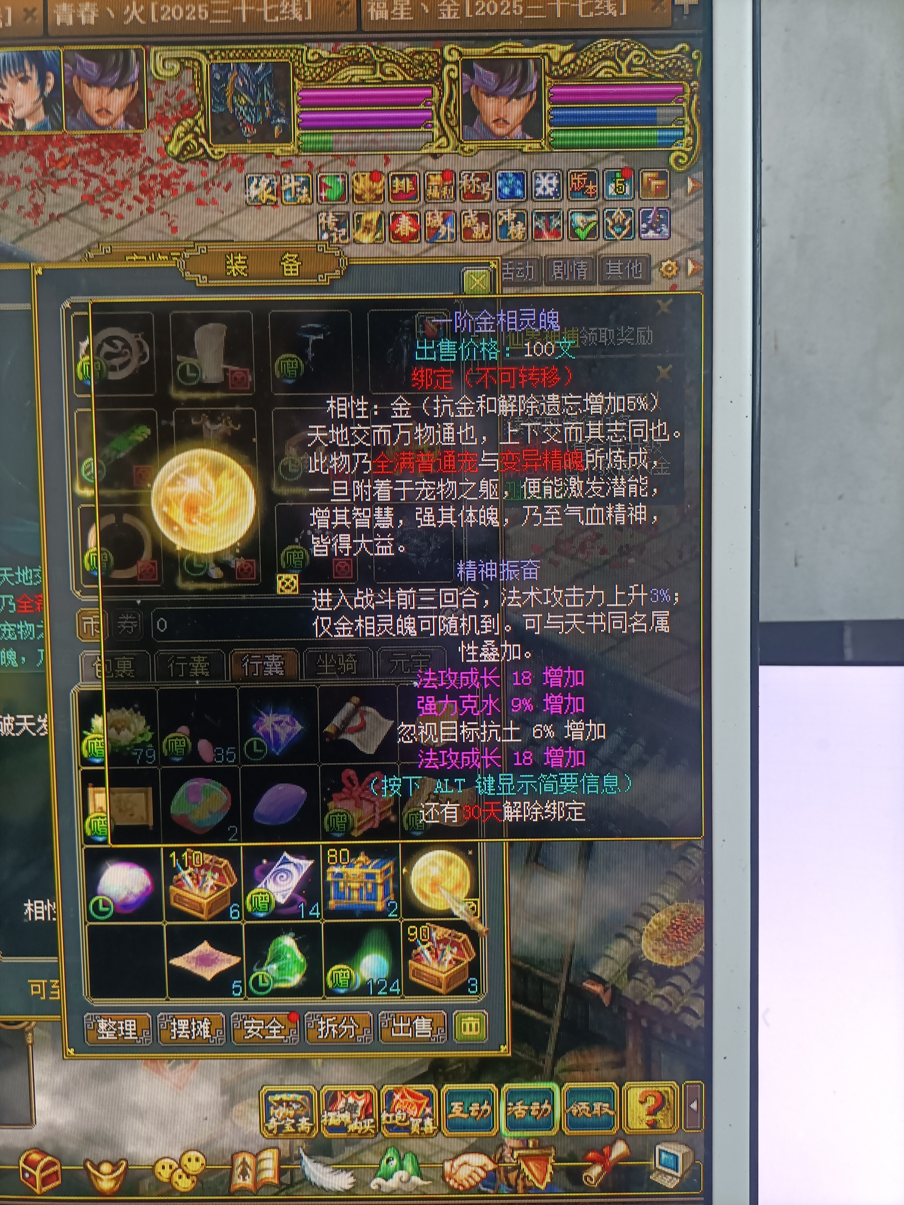 第二十七天,看着宝宝的法伤,想着把灵魄整一下,反正要长期用,整成双18的,现在的已经老实了,1000块整了四个,有两个**的自己用,双法攻加精神的卖,就亏在有个号洗了4.8E才出法攻加精神,变成双法攻加精神,解绑了卖了能抵那个4.8E。但是真给我洗怕了,要是后面的号也洗4.8E洗不出来,就坑这里面了。细算了一下就亏在锁灵魄属性28元,4个116。单属性18的本身是我的,洗出来一个蓝法攻,一个粉精神,两个都能卖3E,单18粉红攻是1.7有两个,两个提升了价值2.6E,加其他两个好点一起能卖12E。每天就杀杀妖王之类的,花那么多钱去整划不来,如果每个号花100就能在单法攻18的基础下加个法攻,我还能接受。洗了那个双粉十八加蓝精神花了4点8E真给我吓着了。还是运气好在双粉十八的情况下加个蓝精神,要是只是双十八,就亏大了。真的想卖号了,我真怕那天自己上头又去搞这种。